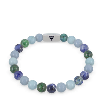 Our Throat Chakra Blend is made up of Aquamarine, Angelite, Sodalite, and Azurite. The Throat Chakra, or Vishuddha, translates to “very pure.” This is considered the fifth chakra, located in the throat. Its color correspondence is blue. The Throat Chakra resonates with self-expression and honest communication. This is the chakra to focus on if you are feeling withdrawn and aren’t able to speak from a place of truth. Someone with a blocked Throat Chakra will feel like they have trouble finding the words to say how they truly feel. If you tend to speak too freely and openly, bordering on dictatorial or offensive, or if you tend to be a poor listener, your Throat Chakra may be overactive. This chakra influences the thyroid, neck, jaw, upper lungs, mouth, and throat. The Throat Chakra gives voice to the heart chakra and controls our ability to communicate our personal power. When it's functioning at full capacity, it allows us to express ourselves truly and clearly.